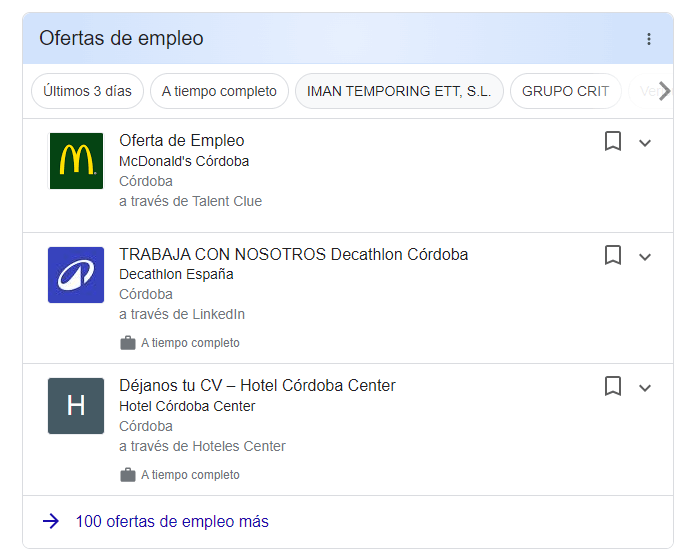 Publicación de empleo (Job Posting): Permite a los usuarios encontrar empleos con detalles como logotipos, reseñas y calificaciones en la búsqueda de empleos de Google.